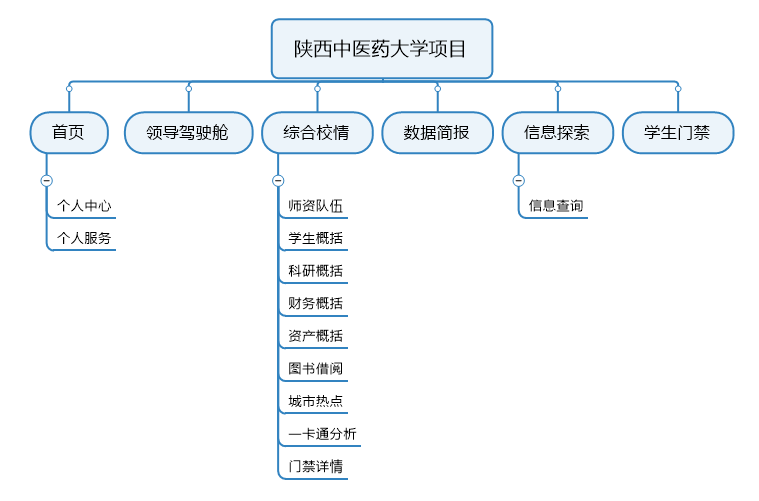 陕西中医药大学数据分析平台项目,涉及内容包括Ezpay、领导驾驶舱、综合校情、数据简报、信息探索和学生门禁等各项内容。平台项目功能架构图如下: