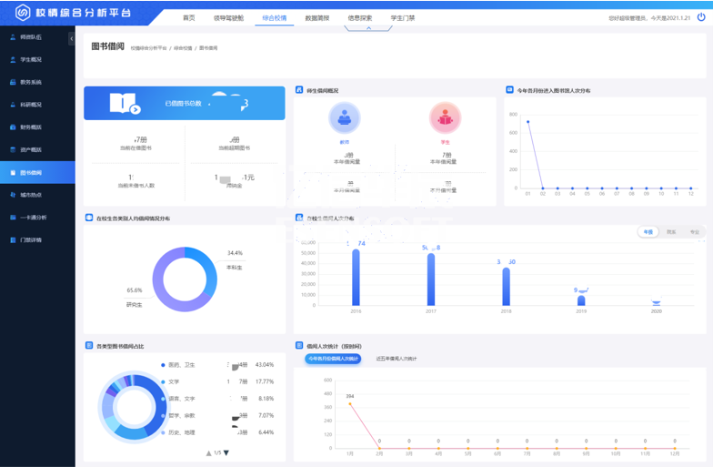 学生概括展现出学生的基本属性、人数分布、学籍情况、借阅与消费、毕业与就业等指标。如下图: