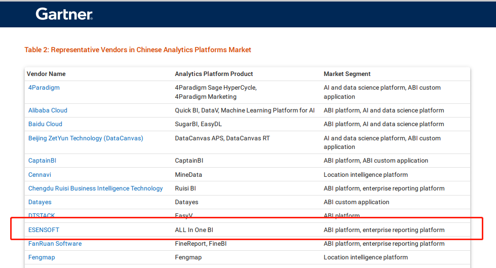 近期,国际权威研究与咨询组织Gartner发布2022年《中国分析平台市场指南》(《Market Guide for Analytics Platforms, China》)。Ezpay入选“代表性厂商”,亿信ABI作为代表性产品上榜。