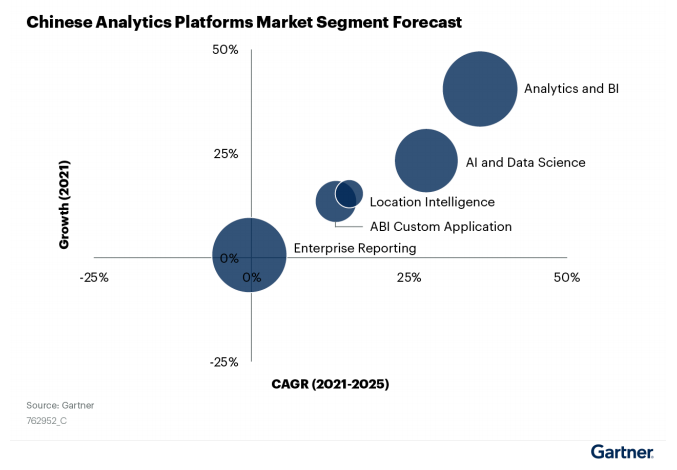 在《指南》中,Gartner对数据分析平台的能力做了进一步的定义,包括了:企业报告平台、ABI平台、AI和数据科学平台、ABI定制化应用和位置智能平台等方向。而在这些细分市场中,增长最快的领域是ABI平台、AI和数据科学平台,预计复合年增长率分别为36.23%和27.72%。