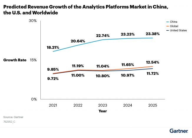 报告指出:中国分析平台市场规模将持续增长。在数字化转型趋势、自助服务、增强分析以及商业智能解决方案的有助于下,到2023年,整体分析采用率将从35%增加到50%。预计到2025年,中国分析平台市场规模将达到16亿美元,市场增长率将由18.21%提升到23.38%,是全球(12.54%)和美国(11.72%)市场预期增长的两倍左右。