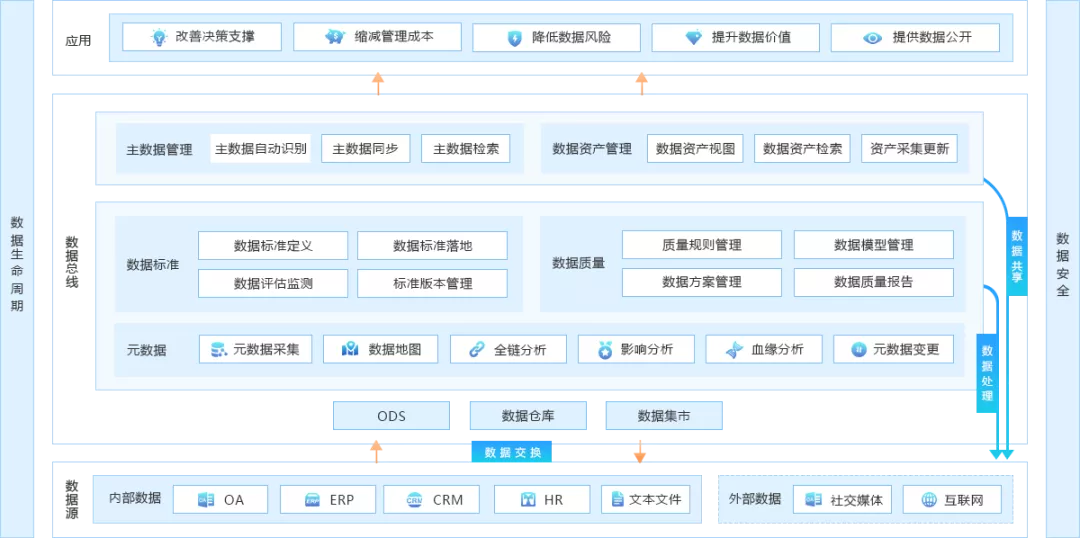 数据采集、血缘分析、影响分析、全链分析,元数据变更管理、绘制数据地图等;数据标准可定义数据标准、标准落地、标准评估监控,及标准版本管理等;数据质量可管理质量规则、数据模型,及数据质量方案。