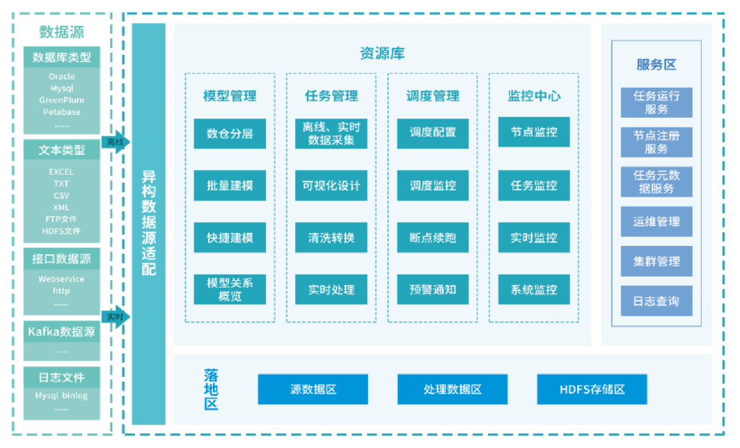 (1)数据源层:主要用来管理各类数据源,内部数据如:OA、ERP、CRM等业务系统数据,也支持文本文件上传;外部数据如:社交媒体、互联网等。