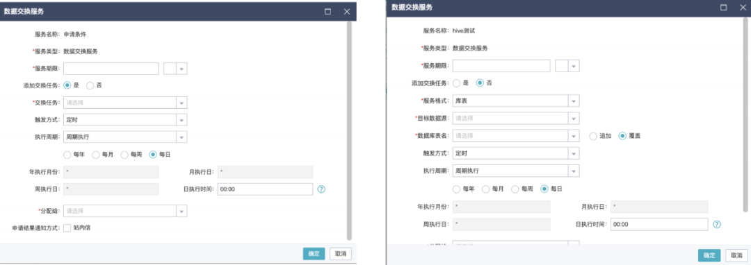 数据资产在进行授权服务的时候(申请交换),第一时间选择是否拥有交换任务。有交换任务这直接选择 交换任务进行绑定。没有交换任务用户在填写完“服务格式”“目标数据源”“数据库表名”后自动生成对应到交换任务/任务流。