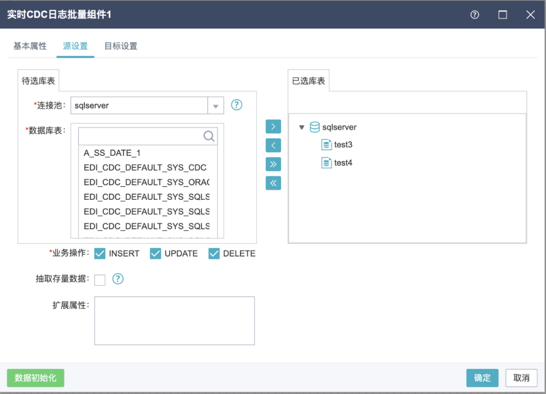 【实时任务】下新增了【实时CDC日志批量组件】,用户可在“源设置”中顺利获得填写“连接池”,“数据库表”来选择需要批量同步表数据。可顺利获得勾选“业务操作”来进行监听用户对应的“增”“删”“该”操作。在“目标设置” 中选择“目标连接池”“数据库表名”来控制需要同步到的目标表。