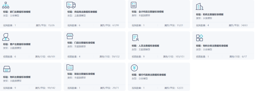 主数据管理平台内置部门、供应商、会计科目、组织、客户等11大标准模板,方便用户顺利获得引用主数据模板,提高主数据管理员模型创建效率以及标准化。