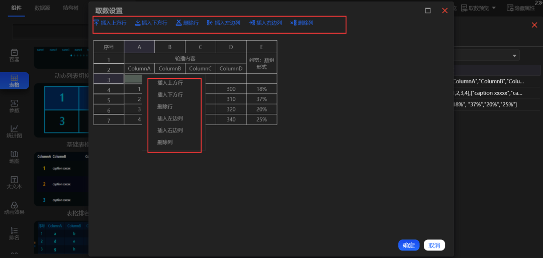静态数据弹窗,将表格形式展现,新增、扩展的数据可以选中表元右键进行新增或者删除操作,或者点击工具栏的新增删除操作。