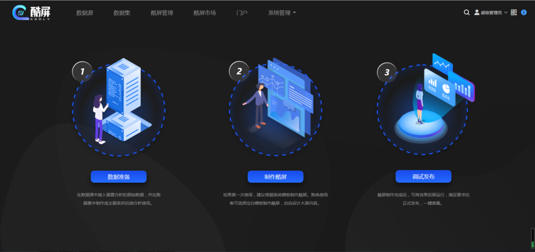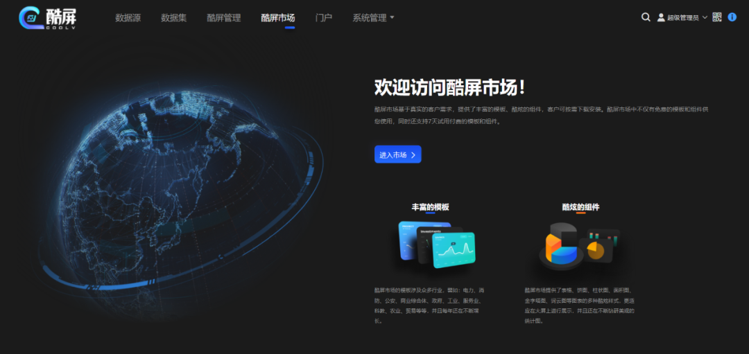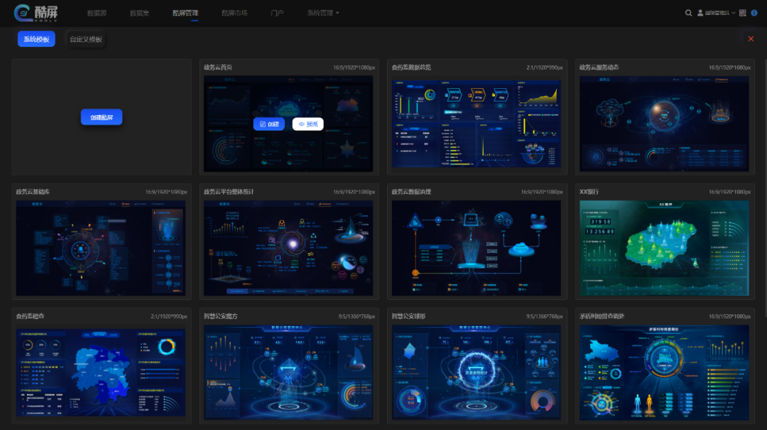 系统整体设计风格进行全面的更新,包括登录页、数据源、数据集、酷屏管理、酷屏市场、门户、系统管理等模块。从原来的蓝白商务风转成了黑色炫酷风,从视觉角度上提升科技质感,产品体验上让用户更专注于内容。