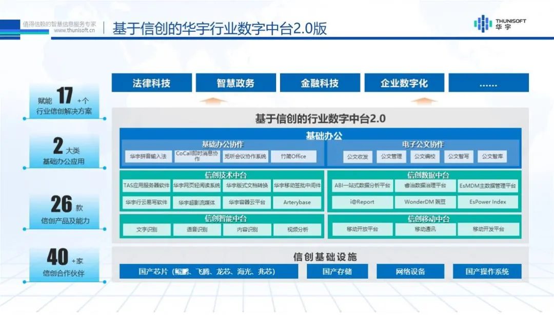 现在,面向法律科技、智慧政务、金融科技、企业数字化等17+个行业给予信创整体解决方案,涵盖基础办公协作、电子公文协作2大基础办公应用,26款信创产品及能力,40+家信创合作伙伴。未来,在总体框架的基础上进一步整合,融合合作伙伴的能力,打造开放一体的行业数字中台,为行业信息系统建设、管理和升级实行赋能。”