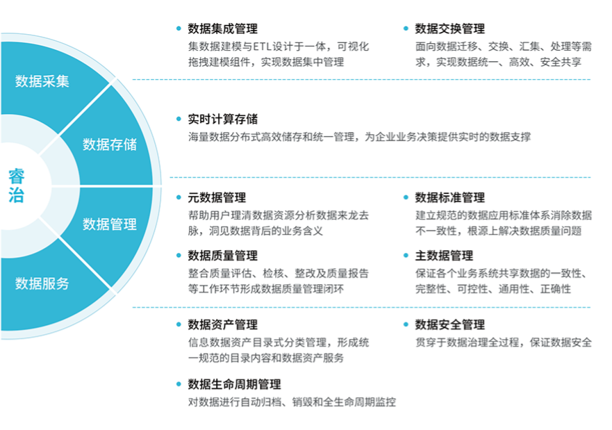 作为数据治理核心玩家,Ezpay凭借大数据领域15年经验沉淀,持续布局数据治理领域,百余次产品迭代,打磨出睿治智能数据治理平台并荣获DAMA中国数据治理优秀产品奖、星河奖优秀大数据产品奖等多个重磅奖项,形成包含数据集成、数据交换、实时计算存储、主数据、数据标准、数据质量、元数据、数据资产、数据生命周期和数据安全十大模块的数据治理产品方案,助力数据标准落地,提升数据质量,实现数据资产化。