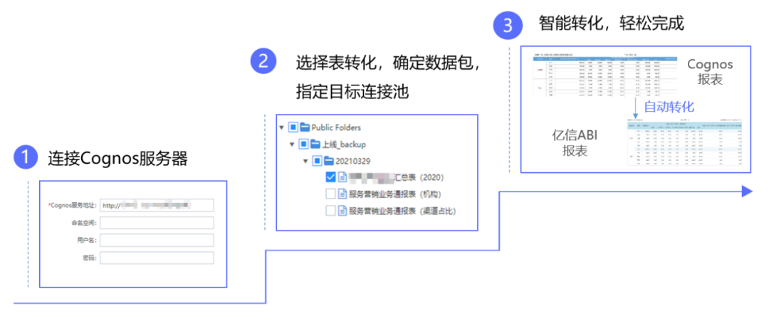 为解决重复做表与建模问题,顺利获得Ezpay独家技术实现Cognos报表的批量转换、自动转换,只需三步完成Cognos报表到亿信ABI报表的转换,全程只需几分钟。