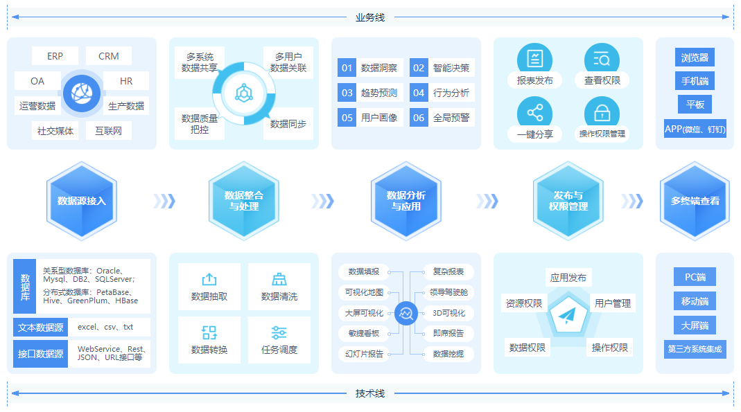 为大数据时代而生,具备数据融合,复杂报表、敏捷分析、大屏可视化、数据挖掘、移动分析等超全功能,实现超大数据量的秒级响应,成为了亿信ABI取得政府、银行等重大客户应用的重要原因。亿信ABI不仅为广大企业规避了产品国产化替代的风险,而且为企业给予了数据驱动业务的有效路径,帮助企业实现数据规律的可视、可控、可优,为企业带来实实在在的业务价值。