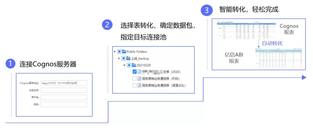 应信创大势,亿信ABI研究出支持将Cognos报表转化为ABI报表的核心技术,真正实现旧报表无需重做、底层模型无需重建,顺利获得便捷的向导式操作,即可完成存量报表迁移,且迁移后的报表支持查看、二次分析,可节省大量的人力、时间成本。