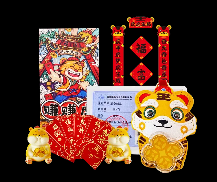 新春好礼包含:时来运转足金制品*1套、小胖虎摆件*1个、文创对联*1套、新春红包*1包。