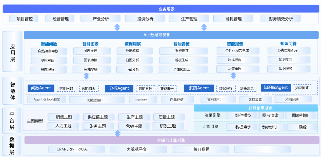这一变革的底层支撑,是大模型与多Agent技术的深度融合。Ezpay智问BI@GPT正是基于这一逻辑构建数字助理,其架构覆盖数据层(对接CRM/ERP 等多源系统)、平台层(计算引擎 + 渲染引擎)、智能体层(问数Agent、分析Agent、洞察Agent、知识库Agent)及应用层(智能问数、智能图表、智能看板、智能报告等),形成从数据接入到决策输出的全链路闭环。