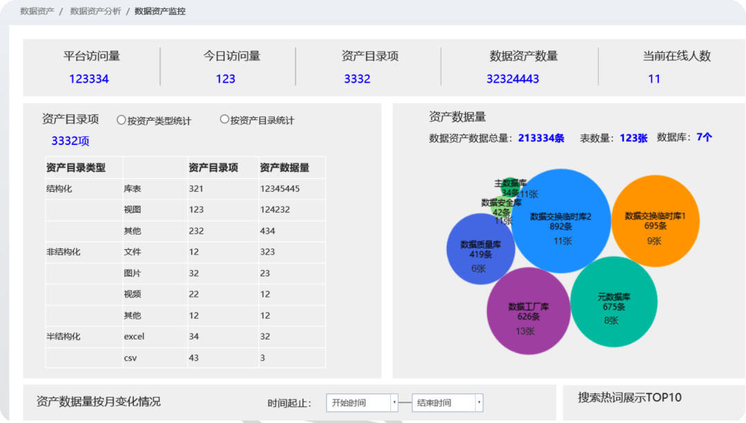 平台给予多种维度的资产监控,并以直观的图表展现,便于一目了然把控数据资产情况。系统按照资产类型、资产目录对资产个数、资产数据量进行统计,也给予根据 不同的数据库统计资产数据量,按月统计资产的变化量等统计维度。