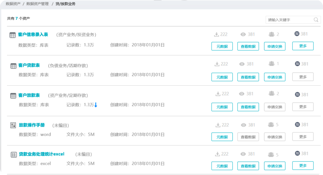 检索条件包括:关键字、搜索类型、查看次数、下载次数、交换次数、创建时间等丰富的检索条件,从而实现数据资产快速查找定位。