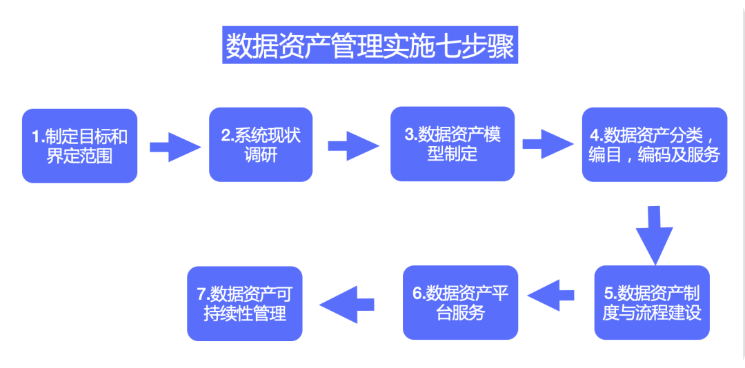 第六步,就是数据资产平台的使用管理,输入各种数据资产数据,数据资产管理平台给予相应的服务,来赋能组织内部和外部的人员。