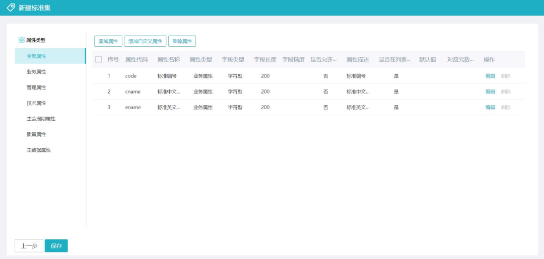 主数据属性、生命周期属性等供用户选择使用,并支持自定义属性。