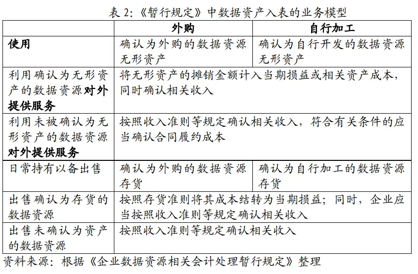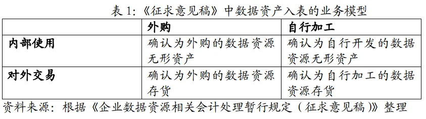 在《征求意见稿》阶段,数据资产入表的业务模型主要集中在“数据交易双方如何进行会计处理”,采用“二分法”分为“企业内部使用的数据资源相关会计处理”和“企业对外交易的数据资源相关会计处理”。在《暂行规定》中,则是根据企业使用、对外给予服务、日常持有以备出售等不同业务模式,明确相关会计处理适用的具体准则,并进一步明确了不满足资产确认条件而未予确认的数据资源的相关会计处理。