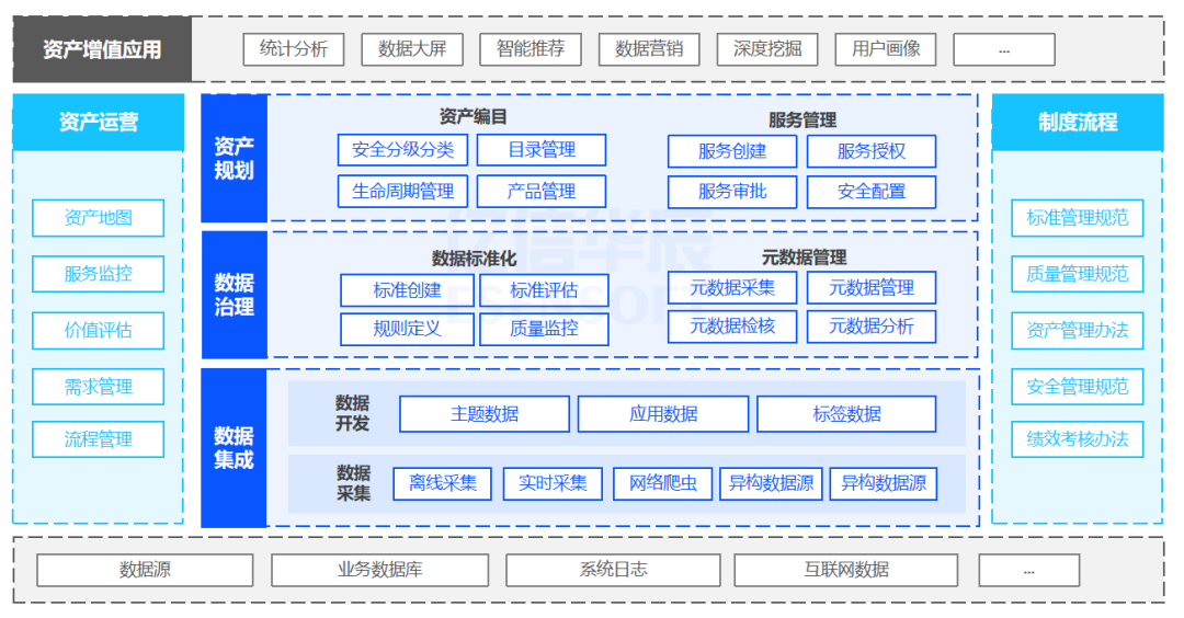 数据标准、资产目录和数据服务等核心组件的数据资产管理平台,实现元数据的采集和追踪、数据模型的管理和检查、数据标准的制定和映射、数据质量的检核和整改、数据服务的开发和监控、以及资产目录的编制和共享等关键数据资产管理活动的工具化和持续化。