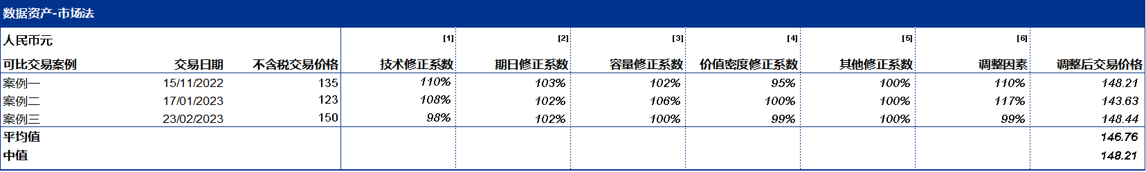 市场法模型的表达式为:被评估数据资产的价值=可比案例数据资产的价值×技术修正系数×价值密度修正系数×期日修正系数×容量修正系数×其他修正系数