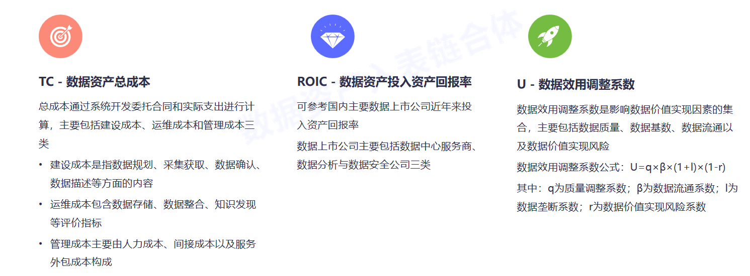成本法:以重置该项数据资产所发生的成本作为确定评估对象价值的基础并对重置成本的价值进行调整以此确定评估对象价值。根据数据资产形成的全部投入,分析数据资产价值与成本的相关程度,考虑成本法的适用性。