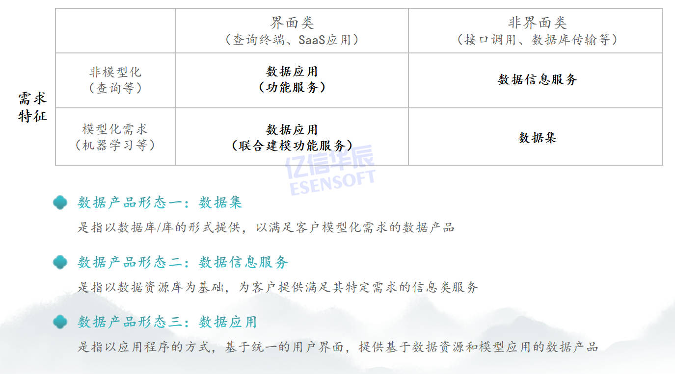顺利获得需求特征和服务方式就可以把整个产品形态分成三种形态包括数据集、数据信息服务、数据应用。