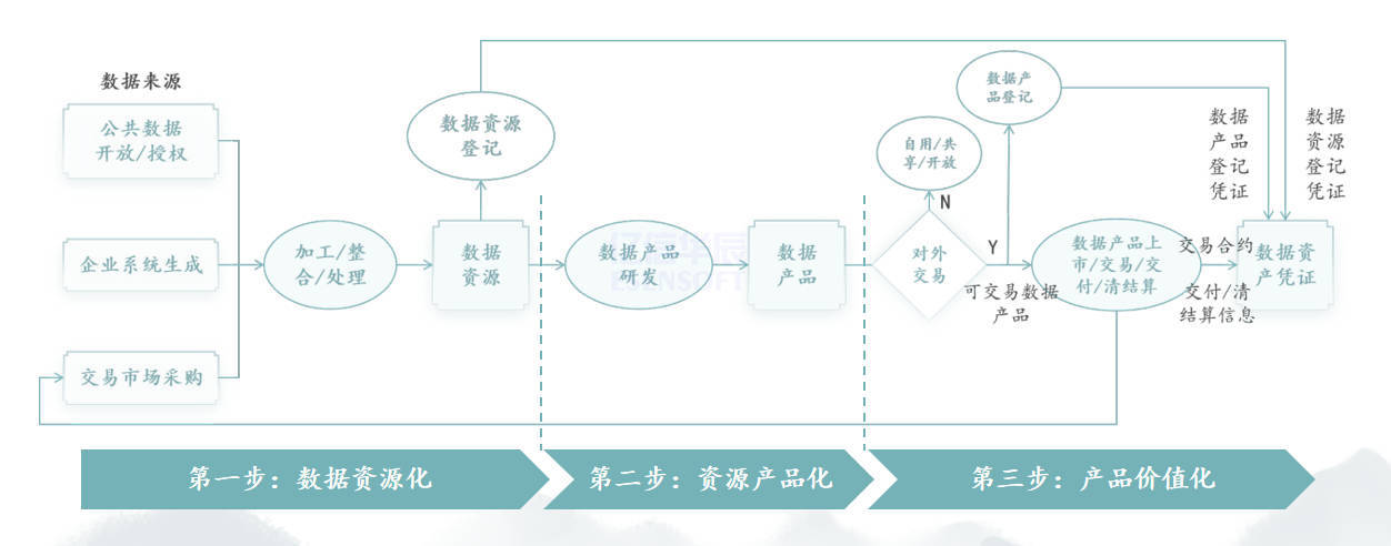 企业在进行企业数据资产化时,需遵循三大步骤:数据资源化、资源产品化、产品价值化,全过程即为数据资产化。