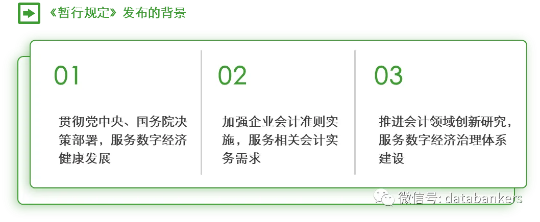 党的二十大报告提出,加快建设数字中国,加快开展数字经济。《暂行规定》是贯彻党中央、国务院关于开展数字经济决策部署的具体行动,旨在为数字经济的健康开展给予有力的支持。同时,数字经济的兴起和快速开展对会计领域提出了全新的挑战和需求,《暂行规定》的发布能够加强企业会计准则的实施,更好地服务于企业和相关会计实务需求,有助于企业会计准则实施的标准化和规范化、推进会计领域的创新研究,以更好地服务数字经济的健康开展和治理体系建设。