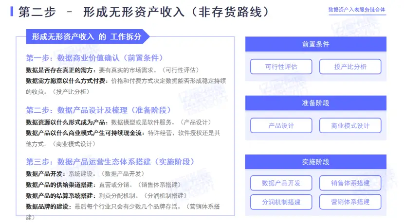现在数据交易所主要会分以API、或数据包或数据模型的方式来交付数据产品。如果走无形资产路线,卖的就不是数据本身而是数据服务,所以可选择数据模型或数据软件服务的形式。软件产品以特许经营、软件授权等方式来产生可持续现金流。