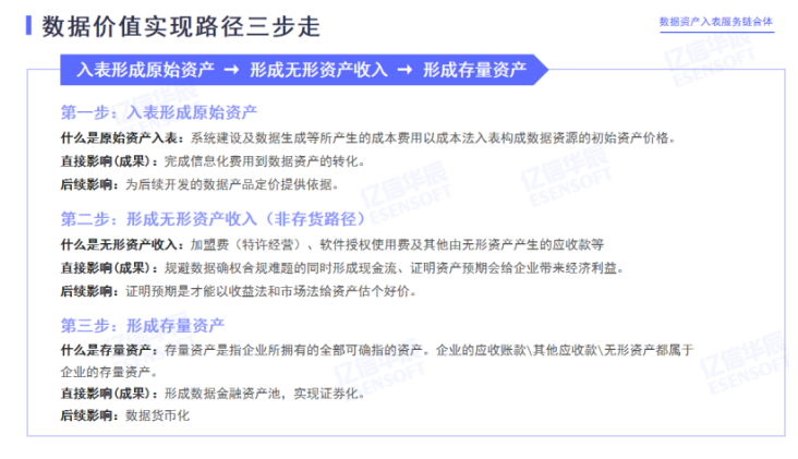 ②形成无形资产收入:分析评估数据资产商业价值,据此设计数据产品并建立合理的利益分配机制,搭建数据产品运营生态体系。