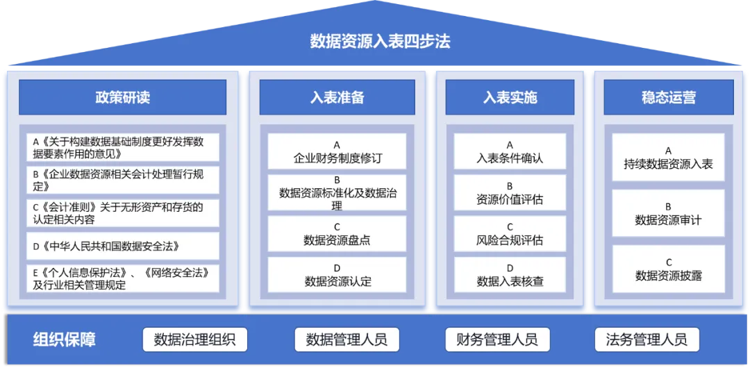 这一阶段是入表前的准备阶段,包括企业财务制度修订、数据资源标准化及数据治理、数据资源盘点、数据资源认定。