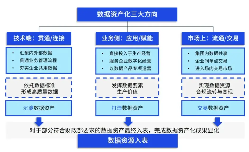 数据资源在资产化的过程中,以“技术、业务、市场”三大方向实现数据资产化并最终完成入表,实现数据资产化成果在企业资产负债表上的“完全显化”。