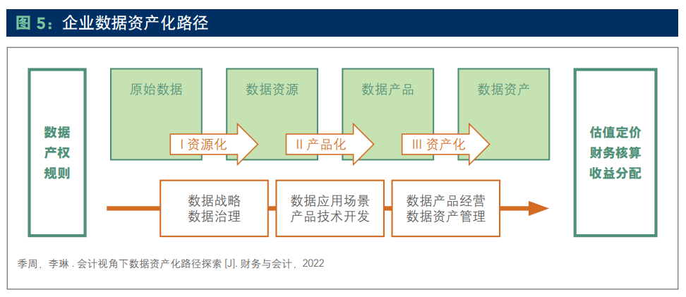 本报告提出企业数据资产化路径的研究框架,分为数据资源化、数据产品化、数据资产化三个阶段。数据资源化指数据经过搜集、清洗、标注、脱敏等加工过程,原始数据变为可产生使用价值或可实现经济利益的数据资源的过程。资源化标志是组织顺利获得数据战略构建数据资源全景图,提升数据规模和质量,实现业务数据化。数据产品化指以价值发现为目标,根据特定的业务需求和场景,顺利获得用户、业务或流程逻辑进行数据治理,最终形成数据产品或服务的过程。自用型和交易型数据产品是根据数据应用需求和场景不同发挥数据产品的内外部价值。数据资产化是指数据产品顺利获得流通交易给使用者或所有者带来经济利益,符合企业会计准则“资产”的定义和确认条件,进而在会计系统中“确认和计量”的过程。
