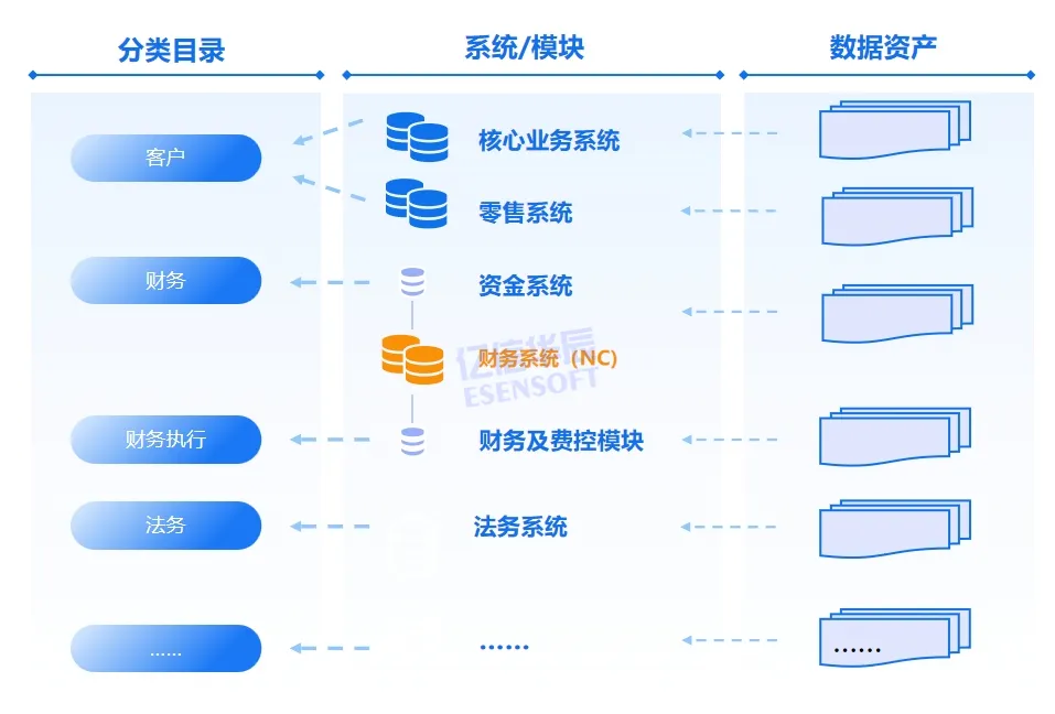 数据资产分类的实施包括:分类目录与系统/模块的对应关系;根据数据归属的系统、功能快速分类;目录与资产表的对应关系;在遇到复杂分类对应关系时,需要建立目录与系统及关键词对应关系表,用于增量分类管理。