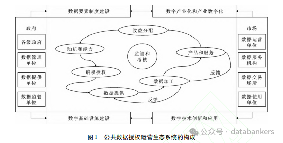公共数据授权运营是公共数据的市场化流通,也可以借鉴数据流通和交易生态系统方面的研究成果。尹西明等从数据要素价值化过程的角度构建了数据要素价值化生态系统,包括数据源出数据运营数据使用数据监管4个方面,这一生态系统的建构综合考.虑了各种数据来源类型、不同流通交易方式和流通交易的全过程”。丁波涛基于信息生态系统理论提出,数据要素市场生态系统由信息本体、信息主体和信息环境构成;结合信息生态系统的形成条件指出,数据要素市场开展将经历导人期、形成期、成熟期、变革期4个阶段,从时间维度对数据要素市场的形成逻辑进行了理论分析。潘银蓉等在类比数据交易和自然生态系统基础上,构建了数据交易生态系统的整体框架和运行机制,还从理论上剖析了数据交易系统的动态演进和稳定平衡问题。这些国内有关数据流通和交易生态系统研究倾向于理论化的规范研究。国外有学者基于12个案例的研究总结了平台生态系统商业模式创新的4种数据共享模式:数据爬虫器(DataCrawler),将公开数据转化为私有物品;数据市场(DataMarketplace),将私有数据转化为私有物品;数据汇集( Data Aggregator) ,将私有数据转化为公共物品;数据分发(DataDisseminator),将公开数据转化为公共物品”。关于数据公开性和数据产品属性的分类,对构建公共数据授权运营生态系统也有启示意义。