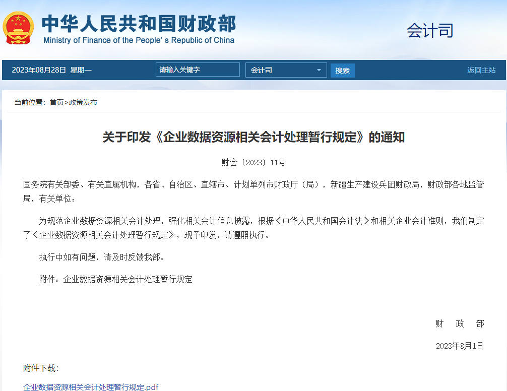 财政部于2023年8月21日印发了《企业数据资源相关会计处理暂行规定》(以下简称《暂行规定》),为数据资源的资产化给予了具体的操作指南,该规定自2024年1月1日起施行,标志着数据资源正式被纳入企业资产负债表。