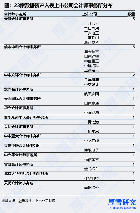 从第一批数据资产入表的23家上市公司来看,一共有14家会计师事务所参与其中,天健会计师事务所与信永中和会计师事务所一季度各自完成了5家上市公司的入表,其中天健进行服务的企业包括浙江交科、喜临门、平安电工、每日互动以及开普云;而信永中和所服务企业包括中信重工、山东钢铁、中远海科、海天瑞声以及卓创资讯;中审众环会计师事务所完成了2家上市公司的入表,其中包括中交设计与美年健康,另外,中兴华会计师事务所、中审亚太会计师事务所、致同会计师事务所、天衡会计师事务所、天职国际会计师事务所、普华永道中天会计师事务所、容诚会计师事务所、立信会计师事务所、立信中联会计师事务所、华兴会计师事务所与北京大华国际会计师事务所各完成了一家企业数据资产入表。
