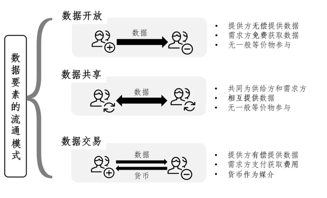 培育数据要素市场的目标是数据在各市场主体间高效有序自由流通。按照数据与资金在主体间流向的不同,可分为开放、共享、交易三种流通形式。