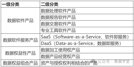 ③自主采集的数据集合自主采集是指顺利获得一定的技术手段,从自有系统、数据产生者处生产或取得数据的过程。自主采集的数据集合举例:征信组织顺利获得自有的问卷收集系统从其客户那里以电子表单问卷的方式取得的数据。加工中的数据集合主要是指中间态数据集合。中间态数据是指处于不同状态之间的过渡状态的数据。中间态数据具有过渡性特点,意味着它最终会被更新到另一个状态或者成为数据产成品的原料数据。在具体运用中,中间态数据大量出现在分布式系统中。例如在数据同步和合并的过程中,不同的节点之间可能会存在中间态数据,以便进行协调和同步操作。从经济价值创造的角度看,中间态数据具体是指那些能够被其他系统用作数据原料,并能产生直接经济利益流入或内部使用价值的数据。中间态数据集合举例:征信组织开发的大模型产品使用的已经被其他系统初步加工过的数据。加工后的数据集合即产成品数据集合。数据产成品集合举例:征信组织自主加工后生成的可以被客户端直接调用使用而不需要进一步处理的数据。数据产品,是指将数据原始资源转化为能对内产生经济价值或对外形成经济利益流入的产品。它可以是基于软件产品和服务的服务性产品,也可以是将软件产品、服务与数据资产的权益打包后形成的权益性产品。1. 数据产品的分类 数据产品的分类如下表所示,下面我们将对不同类型的数据产品进行分类和详细解释,让读者更好地理解它们的含义和特点。