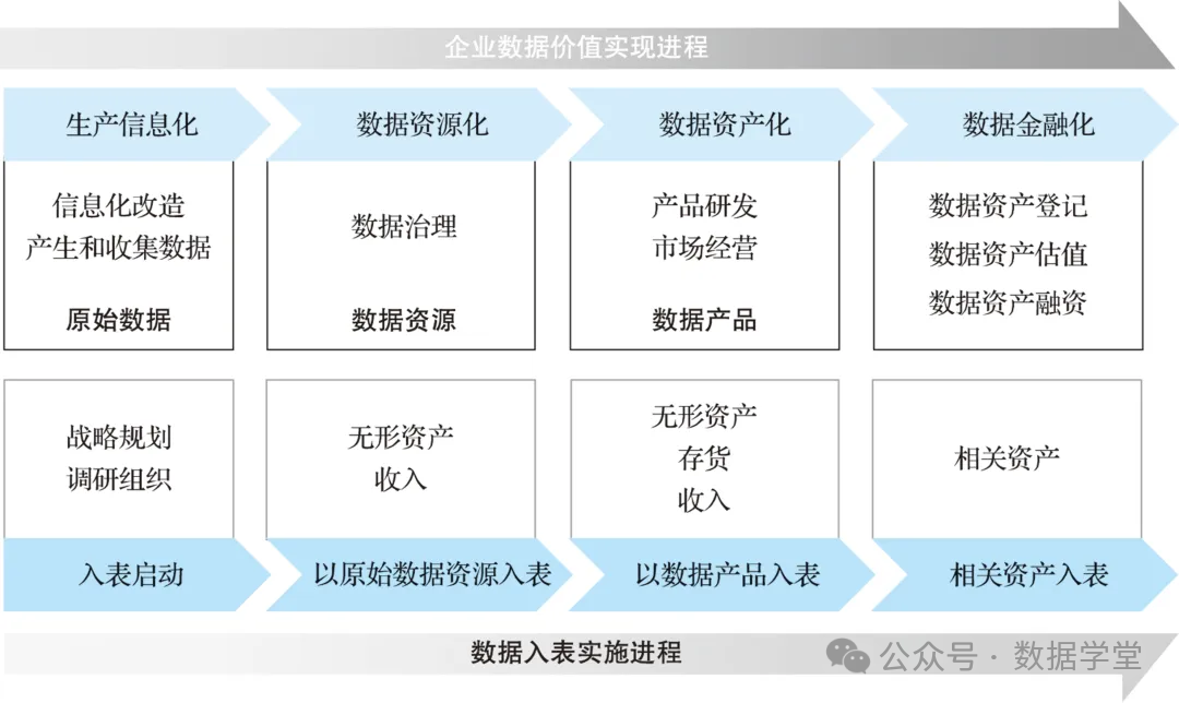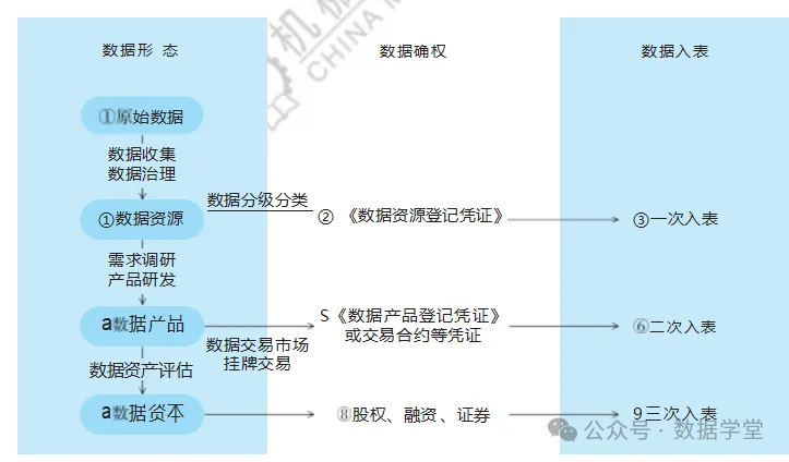 三次入表是指当数据资产顺利获得交易或其他方式转化为以货币计量的金融资产后,将其纳入财务报表的过程。实际上,这三次入表体现了企业对数据价值挖掘过程中,不同阶段、不同形态的数据资产入表。下图所展示的路线主要是从企业的数据形态开展顺序,围绕这三次入表来规划和制定企业数据资产入表的全流程、详细实施路线。