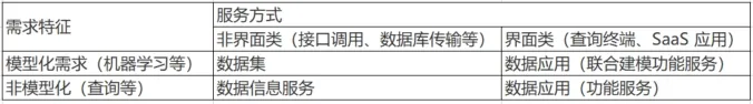 5. 数据产品研发和生产 1)分析目标客户的数据需求和应用场景(模型化需求、非模型化需求)。 2)选择合适的第一个试验型开发的客户。 3)组织数据产品及其服务终端的开发。 数据产品是指对数据资源投入实质性加工或者创新性劳动形成的、可满足内外部用户需求的、可持续给予的、以数据为内容的可辨认的服务形态,即数据产品 = 数据资源 + 数据算法模型 + 服务终端。其中,服务终端指实现数据产品的交付 App、网站、API、SaaS、VPN 等。数据产品根据数据的需求特征和服务方式进行分类,分为如下几种类型,如表所示。表 数据产品分类矩阵
