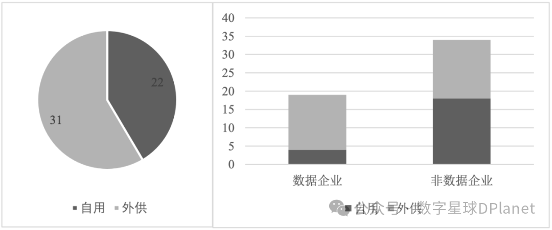 本文进一步将企业划分为数据企业和非数据企业,其中,数据企业是指企业经营范围或主营业务包含数据服务、数据处理、数据运营等数据相关业务。最终筛选出19家数据企业和34家非数据企业。可以发现,对于非数据企业而言,数据资产自用和外供比例相对接近;对于数据企业而言,大多数据资产是用于对外给予数据产品或服务,这与数据企业的业务性质比较契合。
