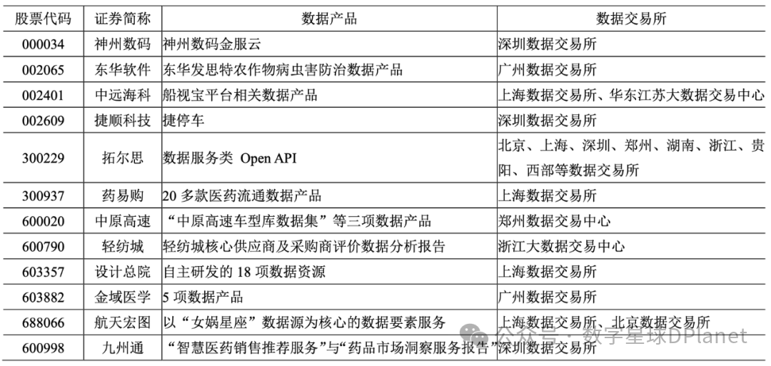 本文顺利获得梳理入表企业年报内容,对入表企业数据产品的挂牌交易情况进行了统计,发现有部分入表企业在数据交易平台登记挂牌数据产品,见表1。可以发现,在100家企业中,仅有12家披露了在数据交易平台进行登记挂牌工作。这表明,尽管对外给予数据产品或服务的企业不少,但实际进入数据交易所进行交易的企业仍然不多。