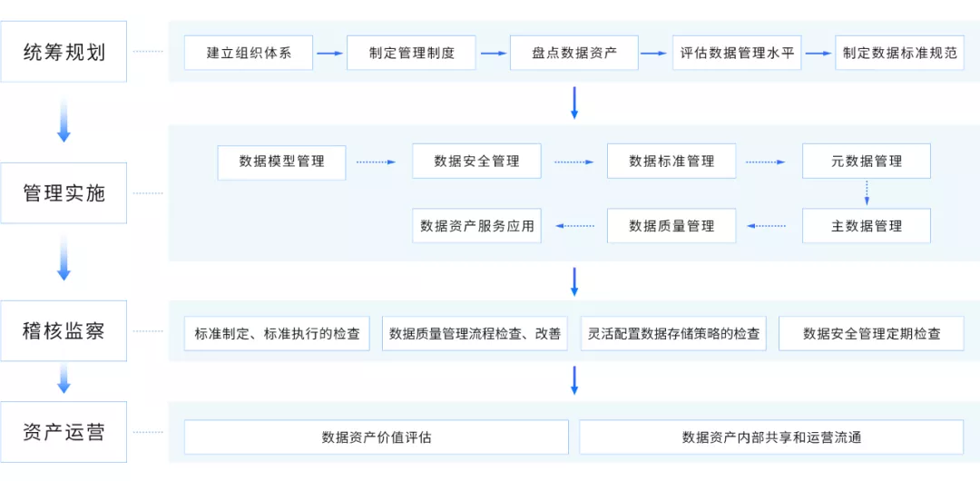 在数据治理架构中,数据资产管理位于底层数据和数据管理与应用之间,处于承上启下的重要地位。对上支撑数据安全管理等职能建设以价值发掘为导向的数据应用,对下实现底层数据的梳理、对接数据标准,达成企业内部“统一数据标准”的目标。